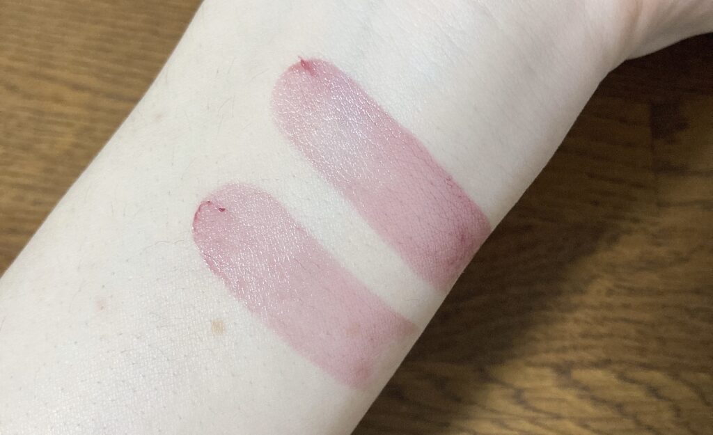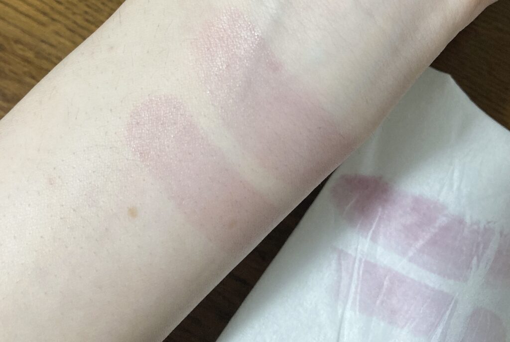 腕で見ると薄く感じますが、実際に唇にのせてティッシュオフしてもリップを塗っているというのがわかるくらい色は残りました。